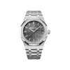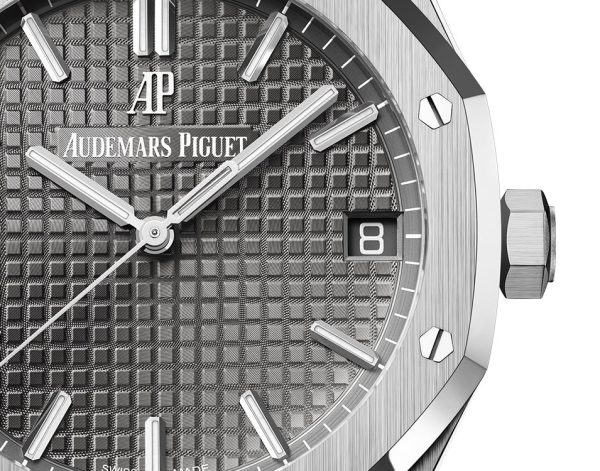 Unworn Audemars Piguet Royal Oak SELFWINDING 15500ST.OO.1220ST.02. 41 mm, Slate grey dial with “Grande Tapisserie” pattern, white gold applied hour-markers and Royal Oak hands with luminescent coating, Stainless steel case, glareproofed sapphire crystal and caseback, screw-locked crown, 4302 calibre, Selfwinding movement, 70 h power reserve, 32 jewels, Stainless steel bracelet with AP folding clasp. Water resistant to 50 m.