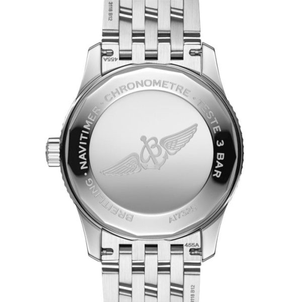 Breitling Navitimer Automatic 38 watch, polished stainless steel, 38mm case, Reference A17325211C1A1. This model has Blue dial with a fine sunray finish. Silver dial flange with Tachymeter scale around the outer rim. Polished luminous silver-tone hour and minute hands and applied steel index hour markers. Fine printed minutes/seconds track. Date window located the 6 o’clock positions. Stainless steel Pull / push non screw-locked crown with a two gaskets and logo Breitling. The dial closed by a Cambered sapphire crystal, glareproofed both sides. The screwed solid case back is made of Stainless Steel. The watch is equipped bidirectional rotating beaded Stainless Steel bezel. The watch is self-winding mechanical Breitling in-house caliber 17 contains 25 jewels and has an approximate power reserve of 38 hours. This model presented on a Polished Straight Stainless Steel Navitimer bracelet with a Stainless Steel Folding Clasp with Safety Latch. The water resistance is up to 30m/100ft.