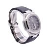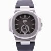 Unworn Patek Philippe Nautilus Annual Calendar, 40.5mm, Stainless Steel Watch. Black Dial with luminous hands and stick hour markers with luminescent fill. Minute markers around the outer rim. Annual calendar complication with day, date, and month is shown in apertures. Date display at the 6 o’clock position. Day of the week and month at the 12 o’clock position. 24-hour and moon phase sub-dial at the 6 o’clock position subdials. The watch dial is protected by a Scratch-resistant sapphire crystal. They have a screw-down crown and transparent sapphire crystal case back. The shape of the watchcase is a Cushion. Fixed silver-tone Stainless Steel bezel. This model has the following features: annual calendar, moon phase, month, date, day, GMT, second-time zone, hour, minute, second. The movement is mechanical self-winding Patek Philippe Caliber 324 S QA LU 24H/303 containing 34 Jewels and has a power reserve of approximately 45 hours. The watch presented on a black crocodile/alligator leather strap with Fold over with a safety release clasp. The water resistance is up to 120m/400ft.