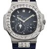 40mm 18K white gold case set with diamonds, sapphire crystal back, screw-down crown, black dial with gold applied hour markers with luminescent coating, self-winding caliber 240 PS IRM C LU movement with power reserve, date by hand, moon phases, seconds subdial, approximately 48 hour of power reserve, leather strap with Nautilus fold-over buckle. Water resistant to 120 meters.