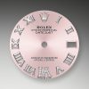 - Dial color: Pink dial with a fine sunrays, applied polished 18k White Gold Roman numerals as hour markers and 11 diamonds on large numeral VI
