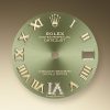 - Dial color: Olive green dial with a fine sunrays, Roman Numerals of 18k Yellow Gold as hour markers and 11 diamonds on large numeral VI