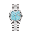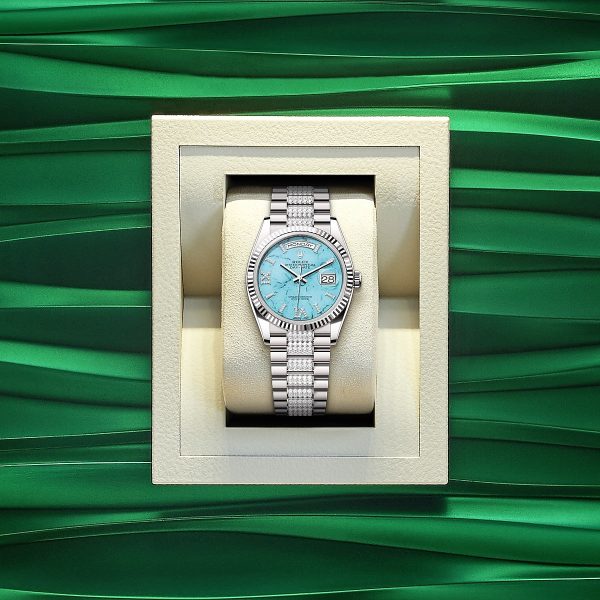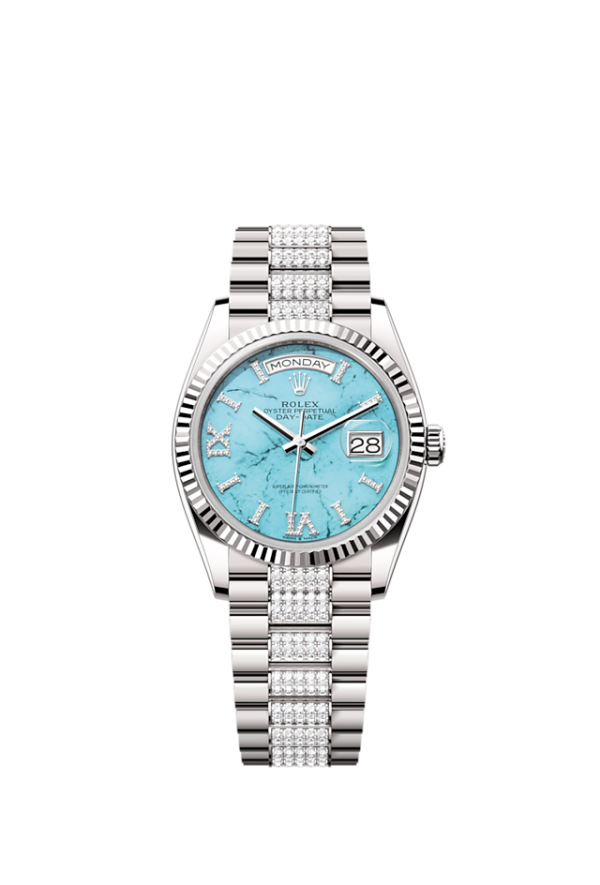 Unworn watch Rolex Day-Date 36, 18k White Gold, 36mm, Ref# 128239-0045. New for 2023 in the Oyster Perpetual Day-Date 36, series are watches with dials made of decorative stones. Thanks to the unique crystallized effects, matrices and veins of aventurine, carnelian and turquoise, and their skillful processing, each dial turns into a unique work of art, being a worthy addition to the rest of the flawless Day-Date details. As always elegant and luxurious Day-Date 36 – is an excellent choice for people who appreciate unique beauty, high style and absolute comfort. The turquoise dial will not leave indifferent any connoisseur of beauty and sophistication. Its index hour markers and Roman numerals VI and IX in 18k White Gold are respectively set with 32 and 24 diamonds, , using a flawless setting and leveling technique that highlights the stones’ subtle brilliance. The classic polished hands made of 18k White Gold look amazing on such a dial, emphasizing the sophistication of the model. The date indicator is traditionally placed at the 3 o’clock position. At the 12 o’clock, position is a semi-circular window showing the day of the week in full, providing an instantly recognizable, unique design of Day-Date. The ribbed screw-down crown in 18k White Gold Triplock with double watertight system, adorned with the Rolex logo, is a traditionally recognizable part of Rolex watches. The dial is covered with a scratch-resistant anti-reflective sapphire crystal and a Cyclops lens above the date with double anti-reflective coating. A solid 18k White Gold screw-down case back with fine fluted edges, closes the movement. The fluted fixed 18k White Gold bezel is not only an aesthetic element of this watch, but also a true hallmark of Rolex. The in-house Rolex mechanical movement, caliber 3255, contains 31 jewels and has an approximate power reserve of approximately 70 hours powers. This delightful timepiece is presented on an 18k White Gold Diamond-set President bracelet with semi-circular 3-piece links for flawless beauty. It features Rolex’s original concealed folding Crownclasp to secure the watch on your wrist. Water resistant up to 100m/330ft (10 ATM). Make: Rolex Model: Day-Date 36 Reference: 128239-0045 Diameter: 36mm Case material: 18k White Gold Dial color: Turquoise Bezel Type: Fixed, fluted Bezel Color: Silver Bezel Material: 18k White Gold Crystal: Scratch-resistant sapphire, Cyclops lens over the date Movement: Perpetual, mechanical, self-winding Bracelet Type: President, semi-circular three-piece links Bracelet Material: 18k White Gold and Diamond-set Clasp: Concealed folding Crownclasp Functions: Centre hour, minute and seconds hands. Instantaneous day and date in apertures, unrestricted rapid setting. Stop-seconds for precise time setting Water resistance: Up to a 100m/330ft (10 ATM) Warranty: Balance of Rolex International Warranty The watch is unworn and comes complete with full set of original accessories, such as watch box, warranty card dated recently, booklets and manuals.