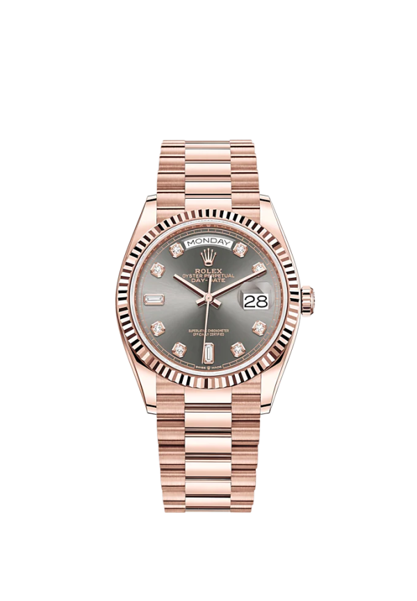 Unworn classic Rolex Day-Date, 36mm, 18k Everose Gold, Ref# 128235-0050 – luxury, elegance and practicality.