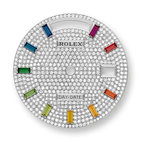 - Dial color: Diamond-paved dial with a rainbow-coloured sapphires as hour markers