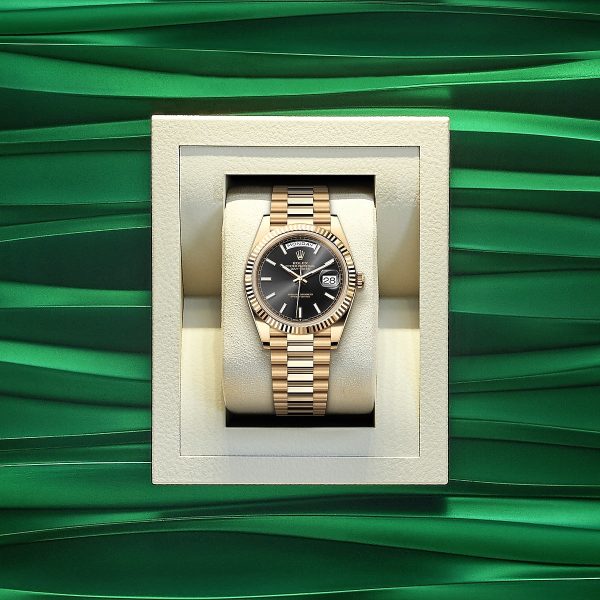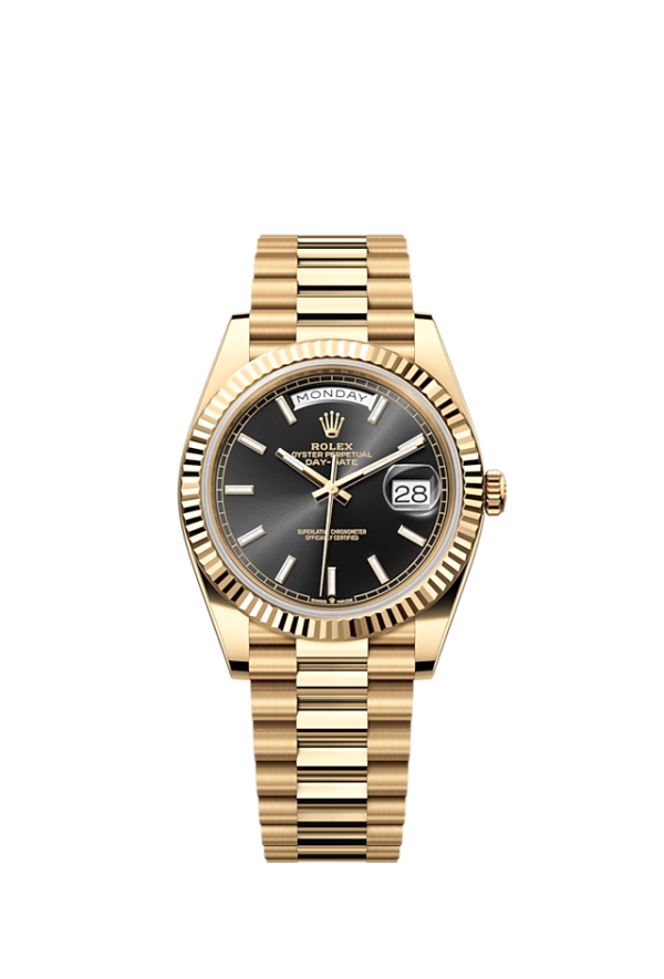 Unworn watch Rolex Day-Date 36, 18k Yellow Gold, 40mm, Ref# 228238-0067. Prestigious Day-Date watches remain at the cutting edge of modernity, despite the many decades passing by. As always elegant and luxurious, they are an excellent choice for people who value unique beauty, high style and absolute comfort. New for 2023 in the Rolex Day-Date 40 line is a model with a Bright black dial sunray finish creates delicate light, with highly legible Chromalight display with long-lasting blue luminescence. Its classic polished index hour markers and hands made of 18k Yellow Gold with lumins fill look amazing on such a dial, emphasizing the sophistication of the model. The date indicator is traditionally placed at the 3 o’clock position. At the 12 o’clock, position is a semi-circular window showing the day of the week in full, providing an instantly recognizable, unique design of Day-Date. The ribbed screw-down crown in 18k Yellow Gold Triplock with double watertight system, adorned with the Rolex logo, is a traditionally recognizable part of Rolex watches. The dial is covered with a scratch-resistant anti-reflective sapphire crystal and a Cyclops lens above the date with double anti-reflective coating. A solid 18k Yellow Gold screw-down case back with fine fluted edges, closes the movement. The fluted fixed 18k Yellow Gold bezel is not only an aesthetic element of this watch, but also a true hallmark of Rolex. The in-house Rolex mechanical movement, caliber 3255, contains 31 jewels and has an approximate power reserve of approximately 70 hours powers. This delightful timepiece is presented on an 18k Yellow Gold President bracelet with semi-circular 3-piece links for flawless beauty. It features Rolex’s original concealed folding Crownclasp to secure the watch on your wrist. Water resistant up to 100m/330ft (10 ATM).