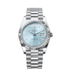 Unworn watch Rolex Day-Date 36, Platinum, 40mm, Ref# 228236-0018. Prestigious Day-Date watches remain at the cutting edge of modernity, despite the many decades passing by. As always elegant and luxurious, they are an excellent choice for people who value unique beauty, high style and absolute comfort. New for 2023 in the Rolex Day-Date 40 line is a model with an Ice Blue dial, the exclusive hallmark of platinum watches with highly legible Chromalight display with long-lasting blue luminescence. Its classic polished index hour markers and hands made of 18k White Gold with lumins fill look amazing on such a dial, emphasizing the sophistication of the model. The date indicator is traditionally placed at the 3 o’clock position. At the 12 o’clock, position is a semi-circular window showing the day of the week in full, providing an instantly recognizable, unique design of Day-Date. The ribbed screw-down crown in Platinum Triplock with double watertight system, adorned with the Rolex logo, is a traditionally recognizable part of Rolex watches. The dial is covered with a scratch-resistant anti-reflective sapphire crystal and a Cyclops lens above the date with double anti-reflective coating. A solid Platinum screw-down case back with fine fluted edges, closes the movement. The fluted fixed Platinum bezel is not only an aesthetic element of this watch, but also a true hallmark of Rolex. The in-house Rolex mechanical movement, caliber 3255, contains 31 jewels and has an approximate power reserve of approximately 70 hours powers. This delightful timepiece is presented on a Platinum President bracelet with semi-circular 3-piece links for flawless beauty. It features Rolex’s original concealed folding Crownclasp to secure the watch on your wrist. Water resistant up to 100m/330ft (10 ATM).