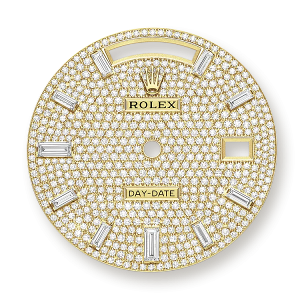 - Dial color: Diamond-paved dial with a 10 Baguette-cut Diamonds as hour markers framed in 18k Yellow Gold