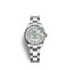 - Dial color: White mother-of-pearl dial with a fine sunrays and 10 Diamonds as hour markers framed in 18k White Gold