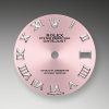 - Dial color: Pink dial with a fine sunrays and a applied polished 18k White Gold Roman numerals as hour markers